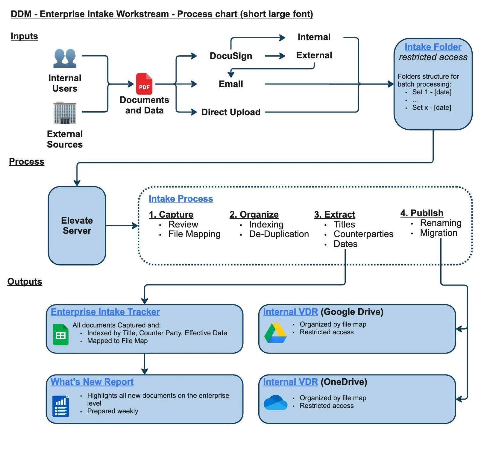 Process: Each document is processed in weekly batches and de-duplicated, consistently named, and mapped to the correct folder.